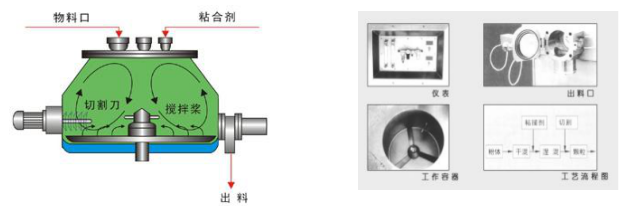 粉體物料與粘合劑在圓筒形容器中由底部混合漿充分混合成濕潤(rùn)材料,然后由側(cè)置的高速粉碎槳切割成均勻的濕顆粒。制粒時(shí)間短。主藥與輔料差異大時(shí),仍能達(dá)到均勻結(jié)合,無(wú)分層現(xiàn)象。